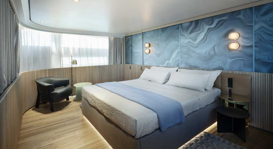Throughout Project 783, interior designer Mark Berryman has created a serene environment, with light-tone fabrics and woods such as oak and sycamore, along with bamboo. They extend through the relaxation zones, including the six staterooms. The six are the bridge-deck VIP, the main-deck master, and four guest accommodations below. The master suite is especially light, and tranquil, upon deploying the fold-down balcony (above).