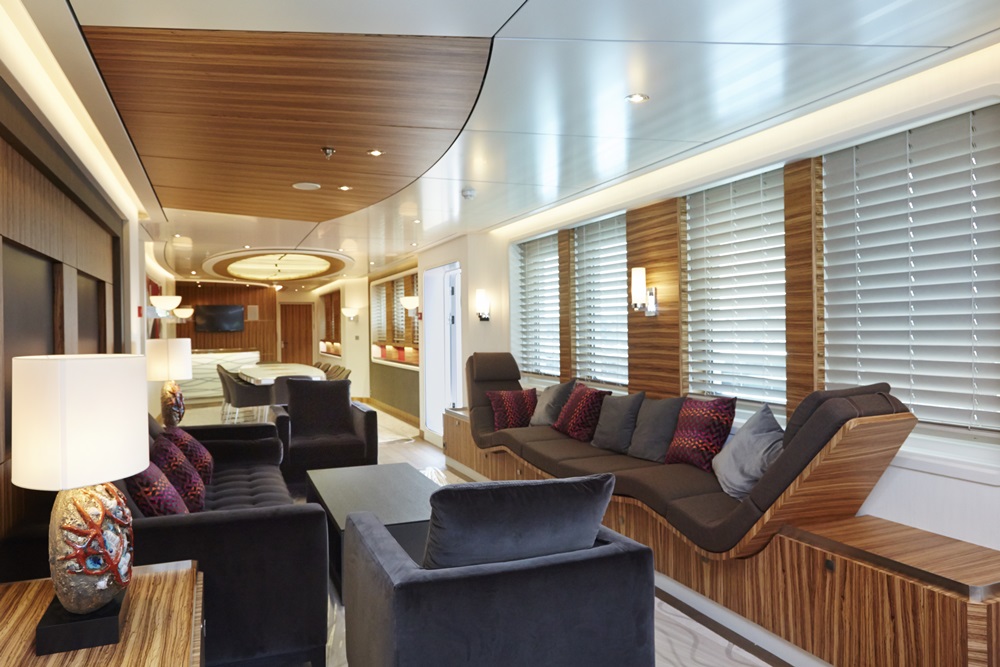 As to Yersin’s performance , the diesel-electric propulsion system, including Schottel azipods, permits a reported 11-knot cruise and a fuel burn of just 100 gph. (Range at that speed: an astounding 15,000 nautical miles.) Reduced to 9 knots, Yersin reportedly burns just 47½ gph.