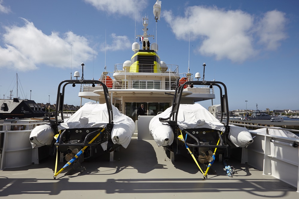Yersin can further stay away from port for 50 days with all 44 people (including 18 passengers) onboard. Seventy percent of her areas are devoted to communal and technical areas, in fact. They include seven guest staterooms, the owner’s suite, two gyms, a hammam, and a cinema. A laboratory, scuba-diving station, and multi-purpose platform for launching and retrieving boats and equipment are all aboard, too. “We can take children on board to educate future generations on protecting the environment,” Fiat comments.