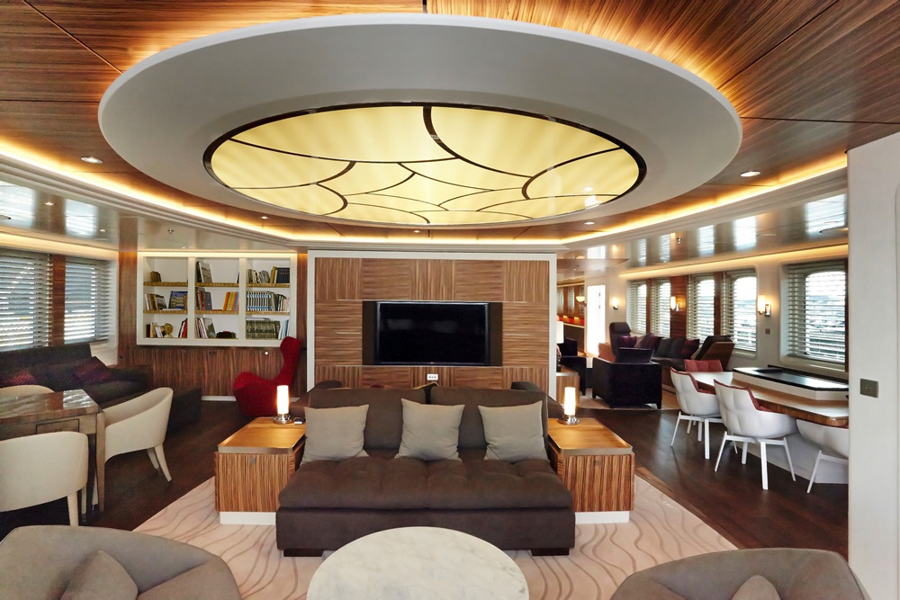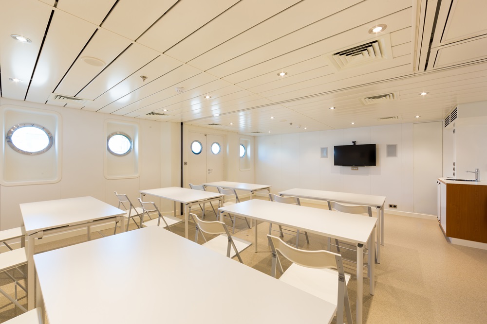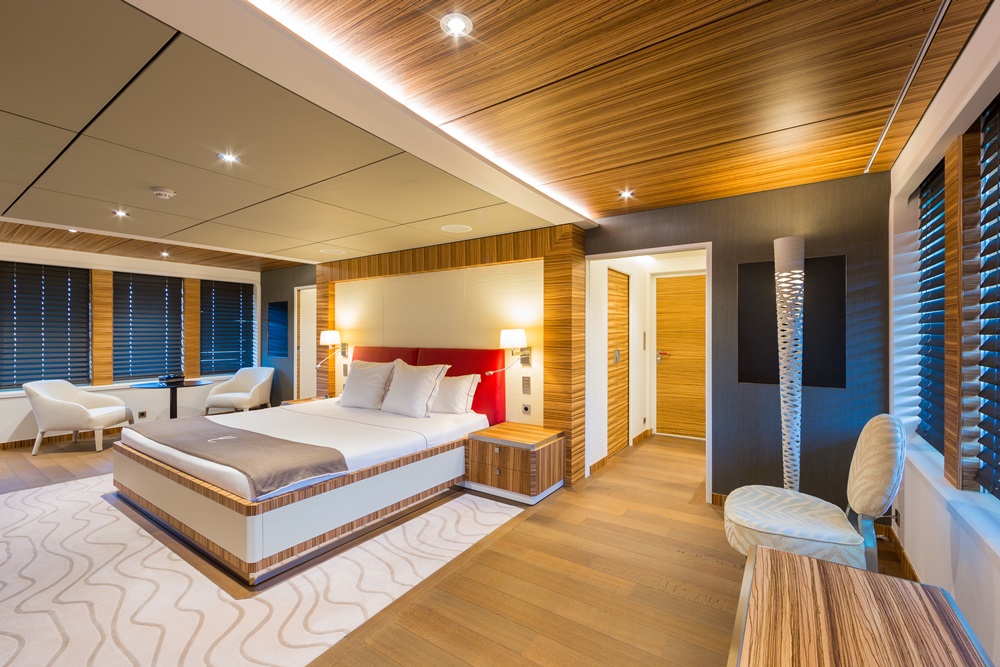 Yersin can further stay away from port for 50 days with all 44 people (including 18 passengers) onboard. Seventy percent of her areas are devoted to communal and technical areas, in fact. They include seven guest staterooms, the owner’s suite, two gyms, a hammam, and a cinema. A laboratory, scuba-diving station, and multi-purpose platform for launching and retrieving boats and equipment are all aboard, too. “We can take children on board to educate future generations on protecting the environment,” Fiat comments.
