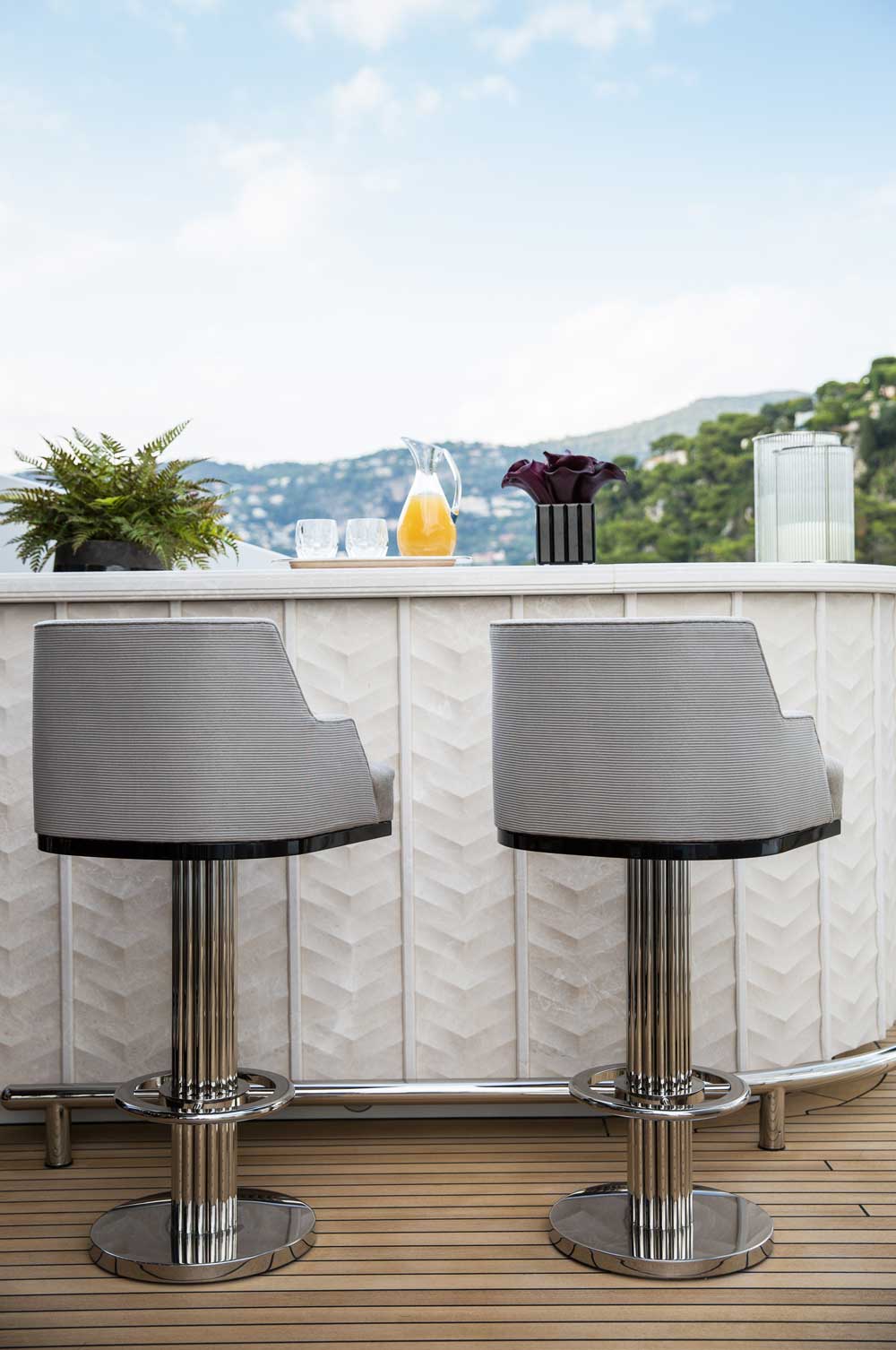 From backlit onyx in the formal dining table, to stainless steel inlays in the main foyer’s marble soles, 11.11 has stunning details. Notably, Candy himself went to marble quarries in Italy to select the marbles and onyxes used onboard. These materials, along with interactive digital artwork like a framed panel of butterflies by artist Dominic Harris, all sit amid a rich glossy walnut-paneled backdrop.